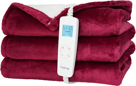 Details: Yashong Electric Blanket Soft Cozy Flannel Heated Throw 50″ x 60″, Fast Heating with 6 Heating Settings & 8 Time Setting (1/2h-4h) Auto of with ETL Certification, Machine Washable (Red Wine)